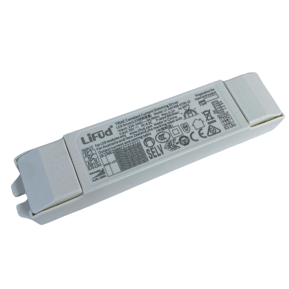 LF-AAT008-0700-12 is an 8W constant current flicker free LED driver. It has TRIAC (Phase) dimming functions. The input voltage range is 220-240Vac. The output current can be adjusted via the DIP switch from 350mA to 700mA (350mA, 400mA, 450mA, 500mA, 550mA, 600mA, 650mA, 700mA), in steps of 50mA.