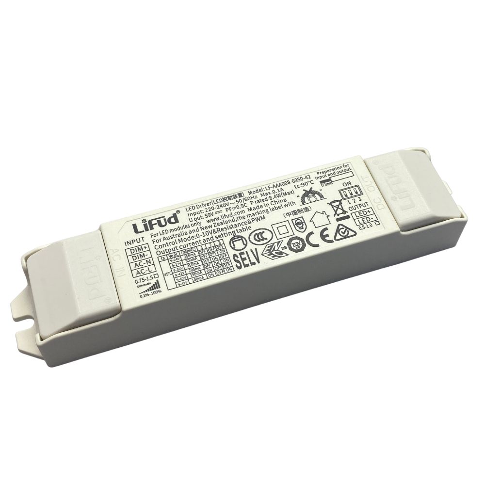 LF-AAA008-0350-42 is an 8W constant current flicker free LED driver. It has 0-10V/PWM/Rx dimming functions. The input voltage range is 220-240Vac. The output current can be adjusted via the DIP switch from 100mA to 350mA (100mA, 150mA, 200mA, 250mA, 300mA, 350mA), in steps of 50mA.