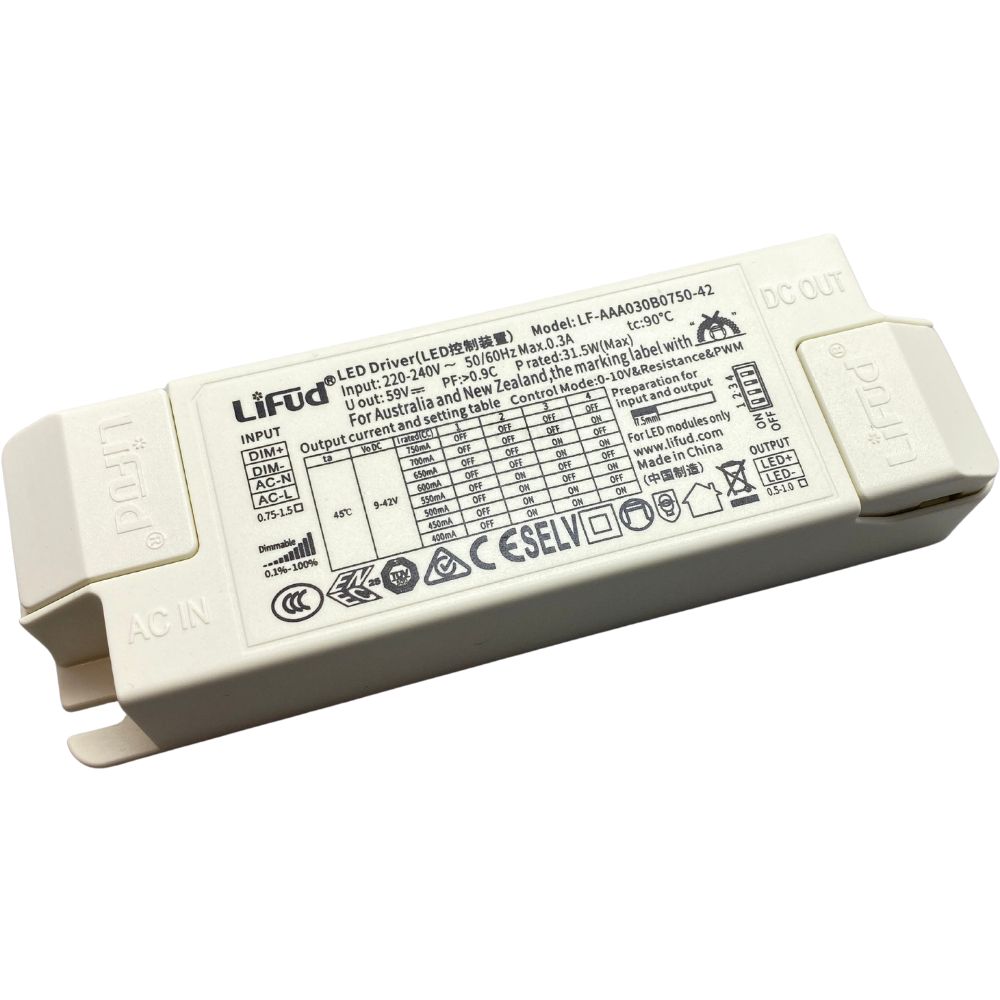 LF-AAA030B0750-42 is an 30W constant current flicker free LED driver. It has 0-10V/PWM/Rx dimming functions. The input voltage range is 220-240Vac. The output current can be adjusted via the DIP switch from 400mA to 750mA (400mA, 450mA, 500mA, 550mA, 600mA, 650mA, 700mA, 750mA), in steps of 50mA.