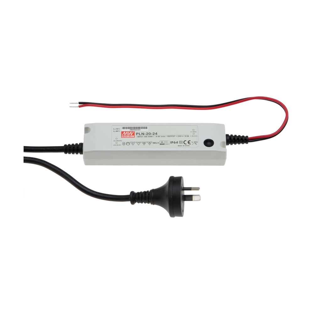 The Mean Well PLN-20-12 is a 20W 12VDC 1.6A LED driver. The Mean Well PLN-20-12 is enclosed in a fully isolated plastic case rated to IP64 which is suited indoor and slightly wet applications. This driver operates in constant current (CC) mode.